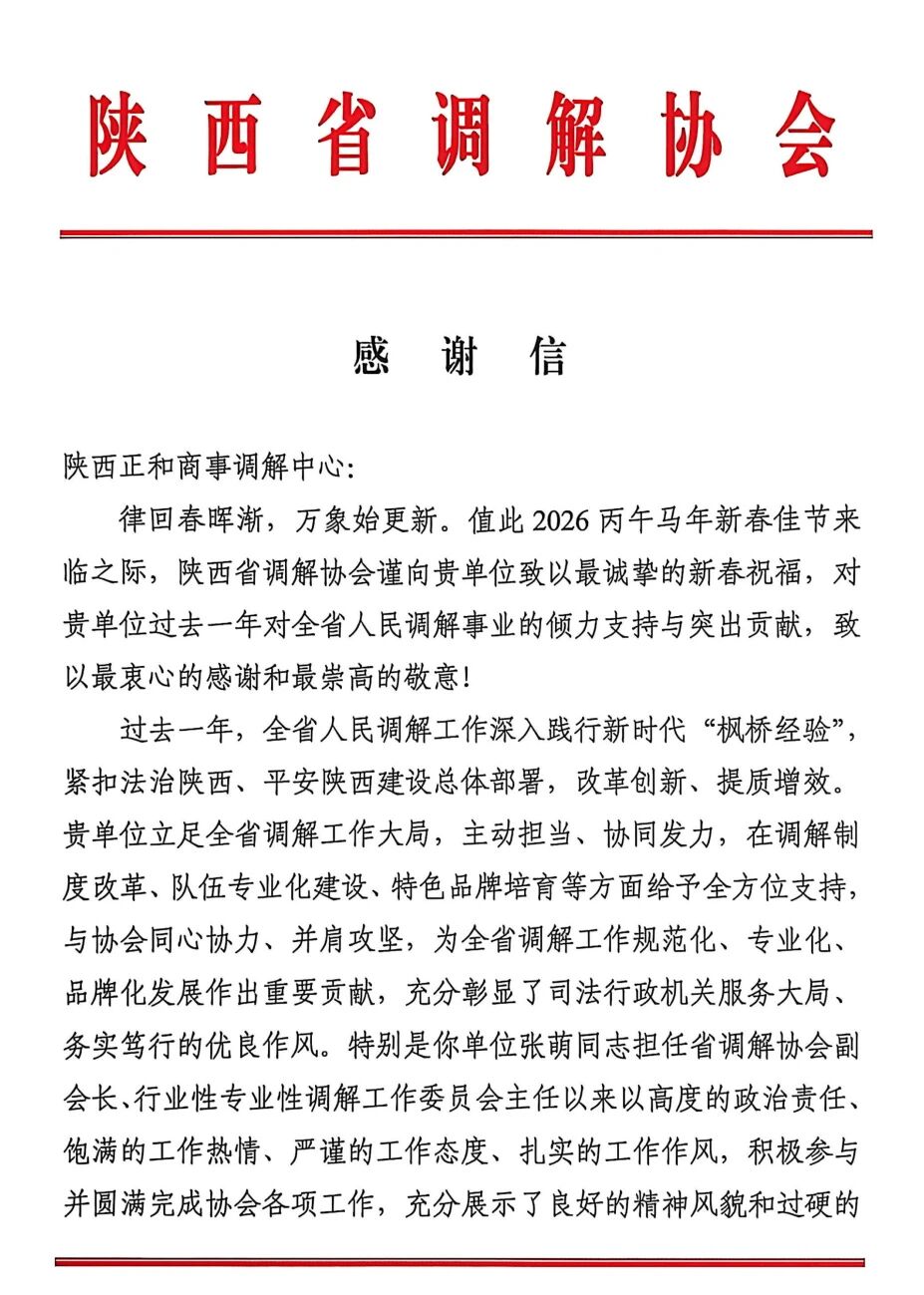 陕西正和商事调解中心获陕西省调解协会感谢信