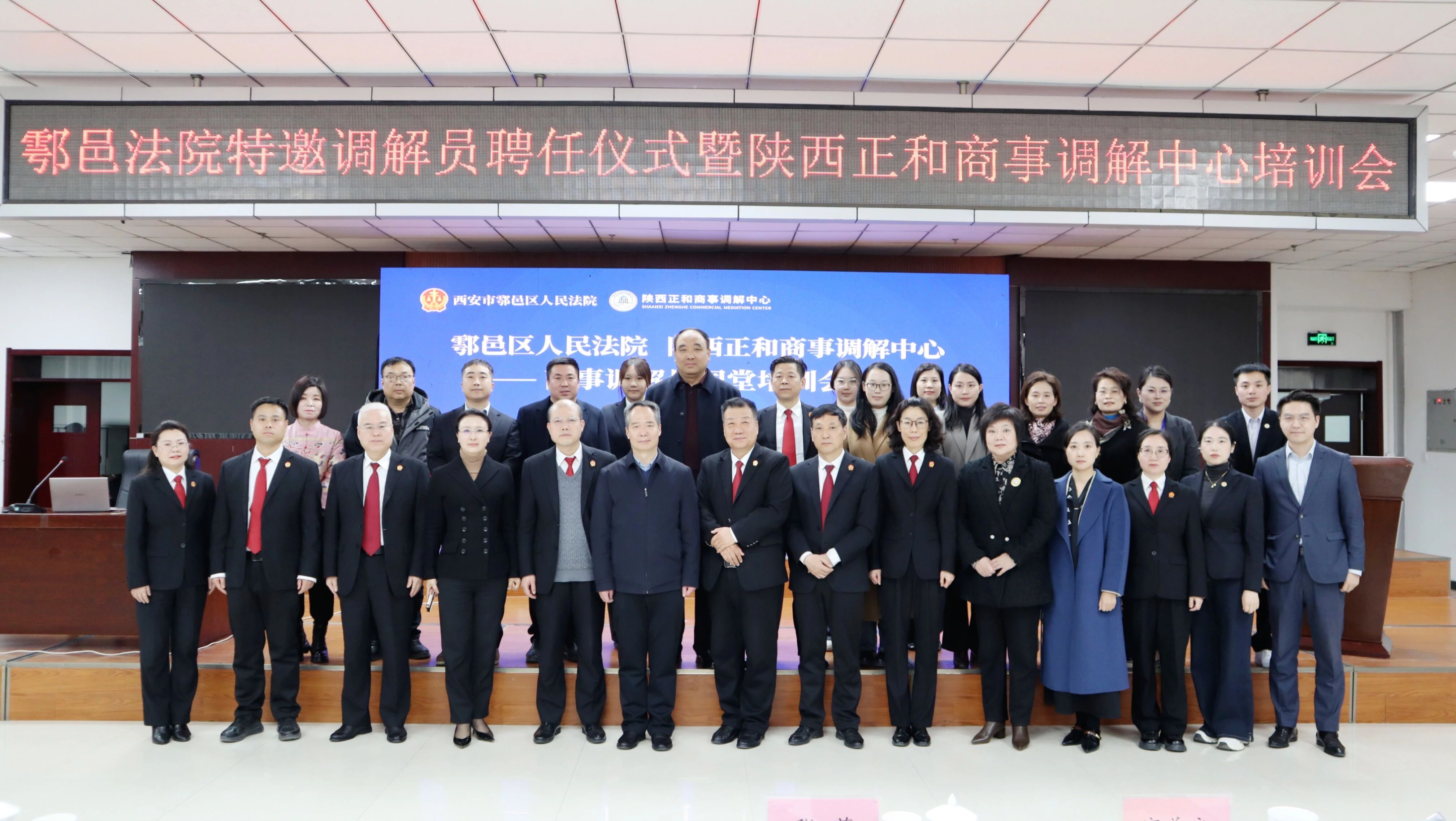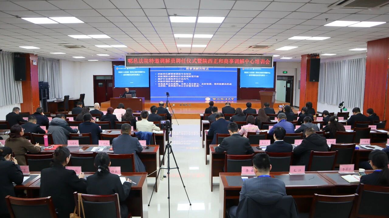为深入贯彻习近平法治思想,践行新时代“枫桥经验”,健全“政协+法院+商事调解员”多元解纷机制,提升特邀调解员专业素养与履职效能,3月4日,西安市鄠邑区人民法院联合陕西正和商事调解中心(以下简称“陕西正和”)举办政协委员特邀调解员聘任仪式暨调解员同堂培训会。西安市鄠邑区人民法院党组书记、代理院长陈庆林率院领导班子及相关负责人全程参会,西安市鄠邑区人民法院党组成员、副院长马凯峰致辞,会议由立案庭副庭长、诉讼服务中心主任董红莹主持。陕西省调解协会副会长、陕西正和商事调解中心理事长张萌;西北政法大学教授、枫桥经验与社会治理研究院院长、陕西正和监事长汪世荣作为核心专家授课。近百名法院干警、政协委员特邀调解员、商事调解员及人民调解员代表参会,以专业赋能推动矛盾纠纷源头化解,为基层治理现代化和营商环境优化筑牢法治根基。