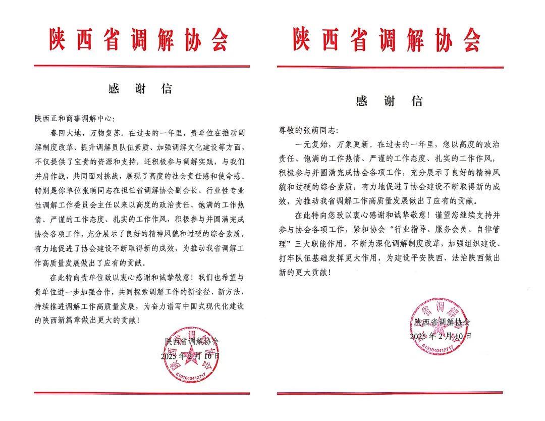 近日,陕西省调解协会向陕西正和商事调解中心及中心理事长张萌同志分别致送感谢信,对其在推动调解制度改革、服务法治陕西建设中的突出贡献给予高度评价,并致以诚挚敬意。对此,陕西正和商事调解中心及张萌同志第一时间作出回应,对省调解协会的认可与支持深表谢忱,并强调将以此为动力,以更高标准、更实举措投身调解事业创新发展。