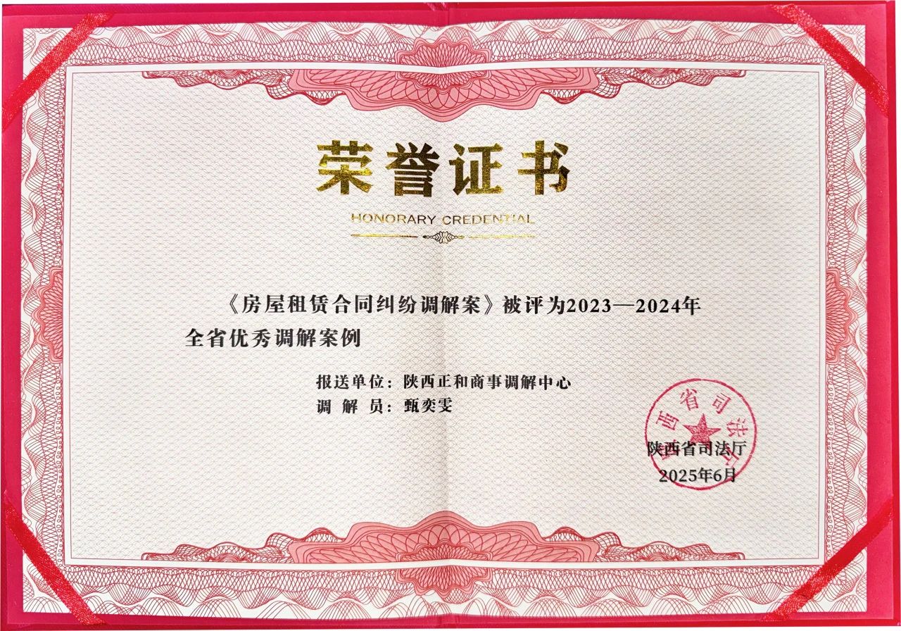 在新时代“枫桥经验”深入推进基层社会治理现代化的背景下,陕西正和商事调解中心凭借卓越的专业能力与创新实践,近日一举斩获陕西省调解协会“枫桥式”优秀调解工作法、陕西省司法厅2023—2024年优秀调解案例两项省级荣誉,成为全省商事调解领域标杆性机构。