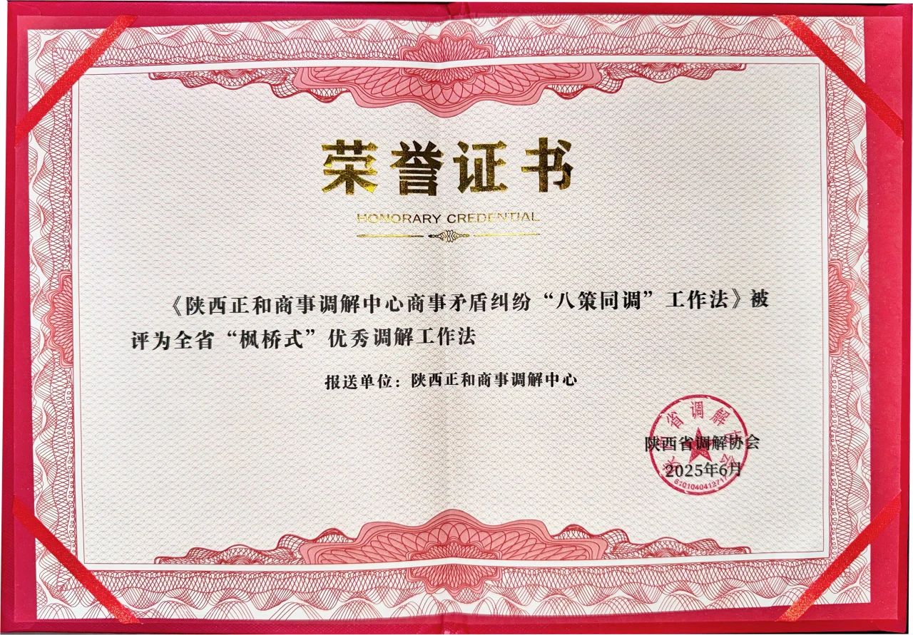 在陕西省调解协会6月发布的表彰决定中,陕西正和商事调解中心首创的商事矛盾纠纷“八策同调”工作法脱颖而出,成为全省首批入选的优秀调解工作法之一。该工作法针对商事纠纷“专业性强、标的额大、利益关联复杂”的特点,整合中立评估、即时履行、一揽子解决、和合厅续谊、联合调解、多元行业专家智库、多层文书审核、虚假调解六防线八大策略,通过精准匹配纠纷类型、动态调整调解路径,构建了“多元联动、高效便捷、标本兼治”的商事纠纷化解体系。