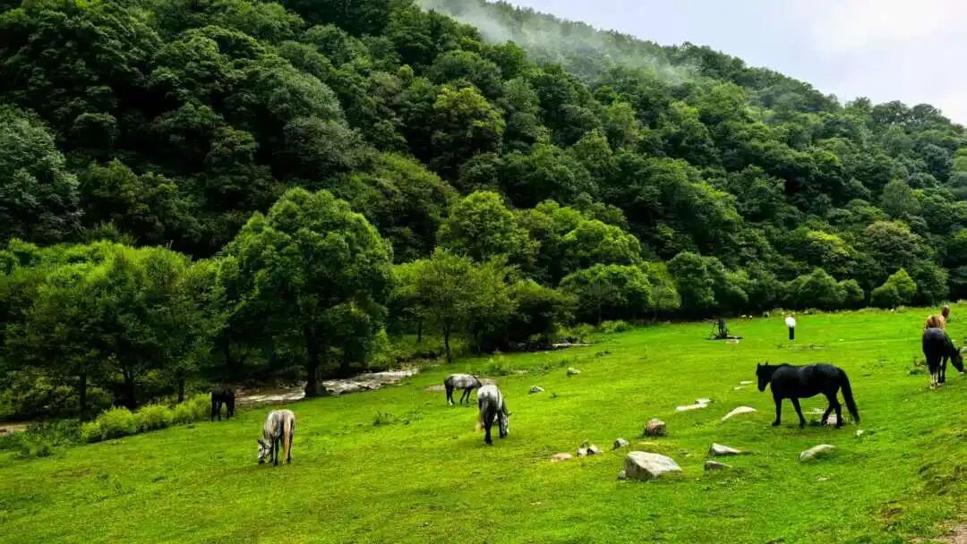 第二日清晨,众人踏入大水川草原,高山草甸如绿毯铺展向天际,牛羊悠然踱步。大家或拍照定格笑脸,或骑马体验驰骋的快意,或三两结伴交流,在辽阔景致中畅享自由。