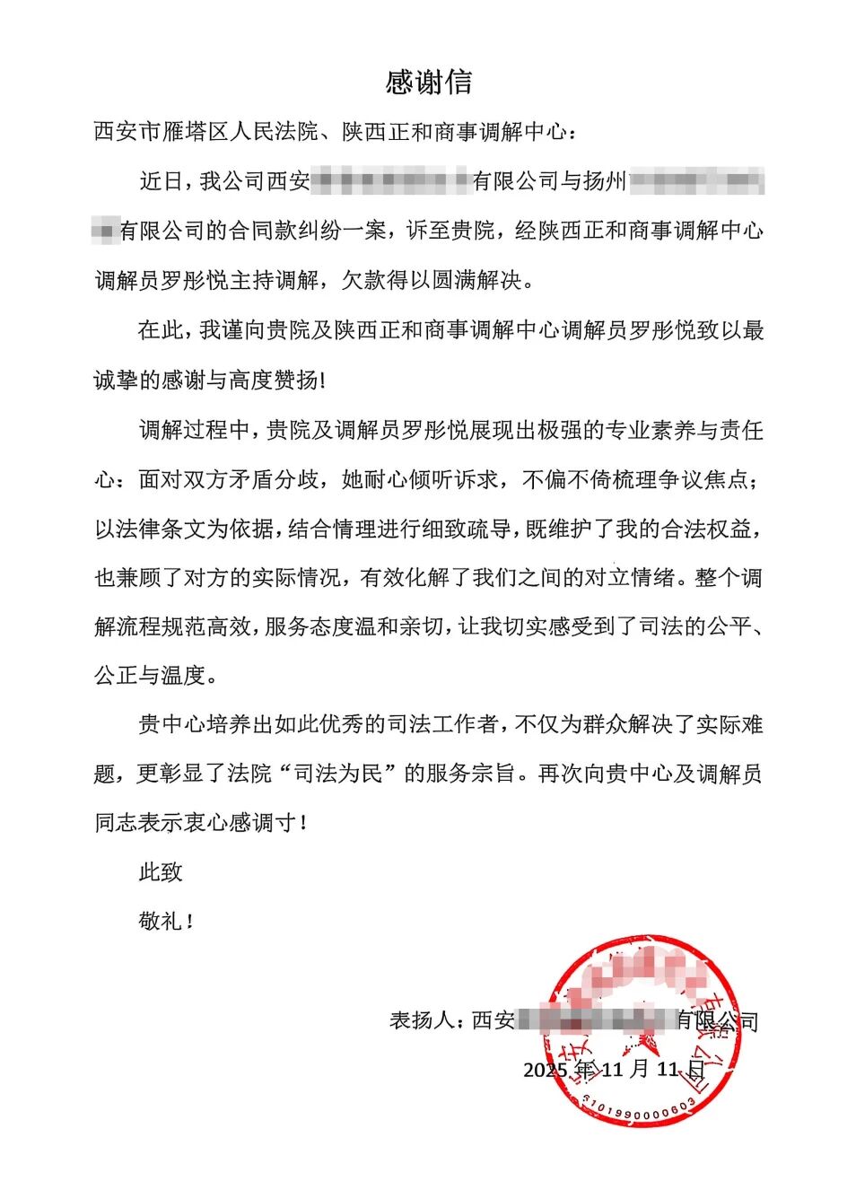 “从一次次失望到全额回款,真的没想到僵持近两年的货款纠纷,能在调解中心的努力下圆满解决!”拿到回款的那一刻,西安某能源技术公司负责人激动不已,专程向陕西正和商事调解中心送来感谢信,字里行间满是对这份“不抛弃、不放弃”服务的由衷认可。