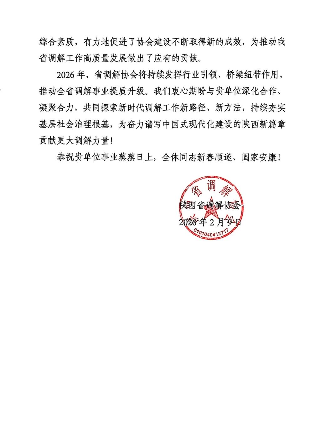 陕西正和商事调解中心获陕西省调解协会感谢信