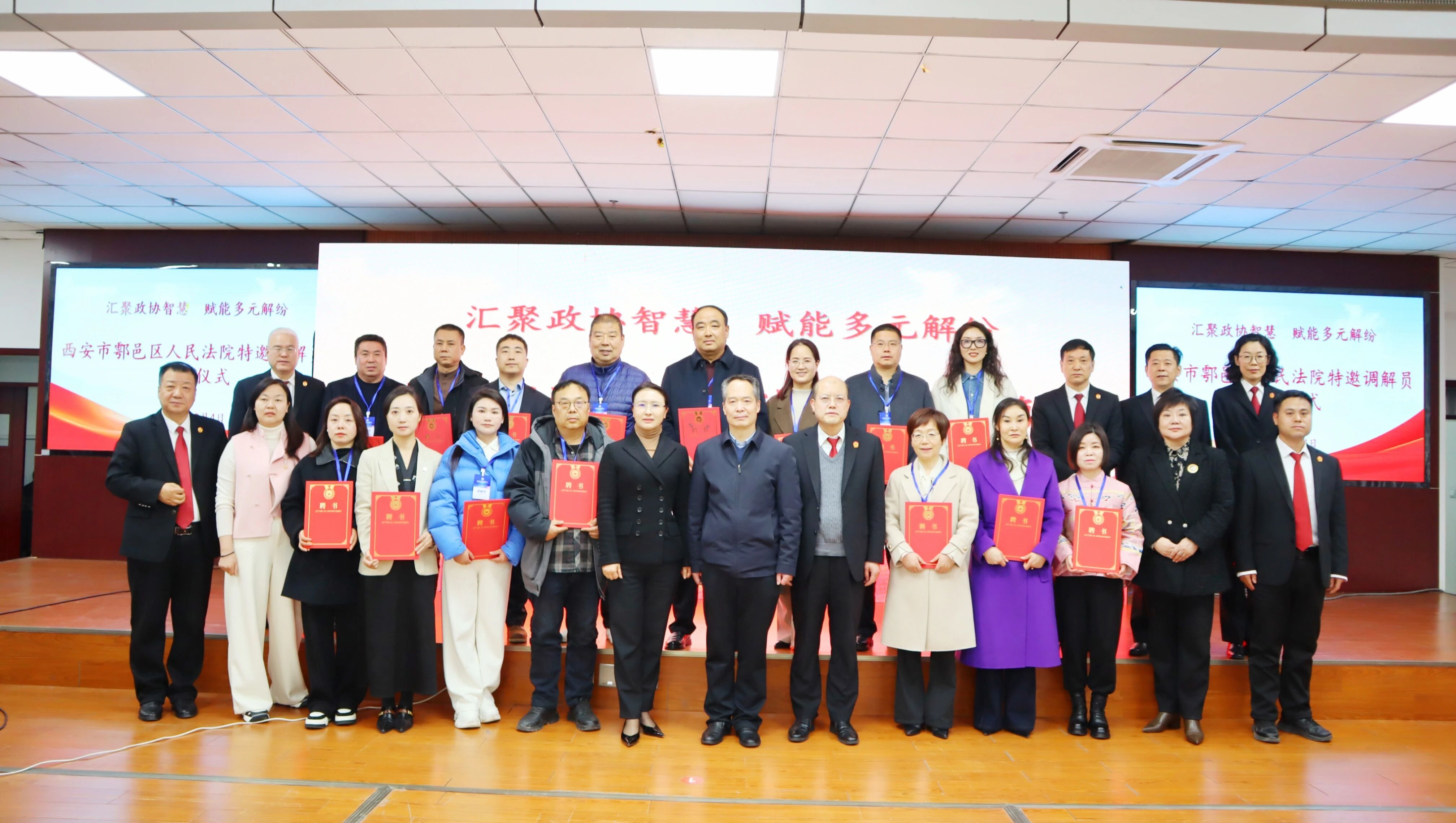 为深入贯彻习近平法治思想,践行新时代“枫桥经验”,健全“政协+法院+商事调解员”多元解纷机制,提升特邀调解员专业素养与履职效能,3月4日,西安市鄠邑区人民法院联合陕西正和商事调解中心(以下简称“陕西正和”)举办政协委员特邀调解员聘任仪式暨调解员同堂培训会。西安市鄠邑区人民法院党组书记、代理院长陈庆林率院领导班子及相关负责人全程参会,西安市鄠邑区人民法院党组成员、副院长马凯峰致辞,会议由立案庭副庭长、诉讼服务中心主任董红莹主持。陕西省调解协会副会长、陕西正和商事调解中心理事长张萌;西北政法大学教授、枫桥经验与社会治理研究院院长、陕西正和监事长汪世荣作为核心专家授课。近百名法院干警、政协委员特邀调解员、商事调解员及人民调解员代表参会,以专业赋能推动矛盾纠纷源头化解,为基层治理现代化和营商环境优化筑牢法治根基。